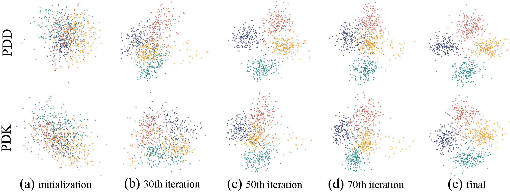 Figure 2: Illustration of convergence, where the top and bottom rows show the results of PDD and PDK, respectively. (a) results of the random initializations; (b) results after 30 iterations; (c) results after 50 iterations; (d) results after 70 iterations; and (e) final results.