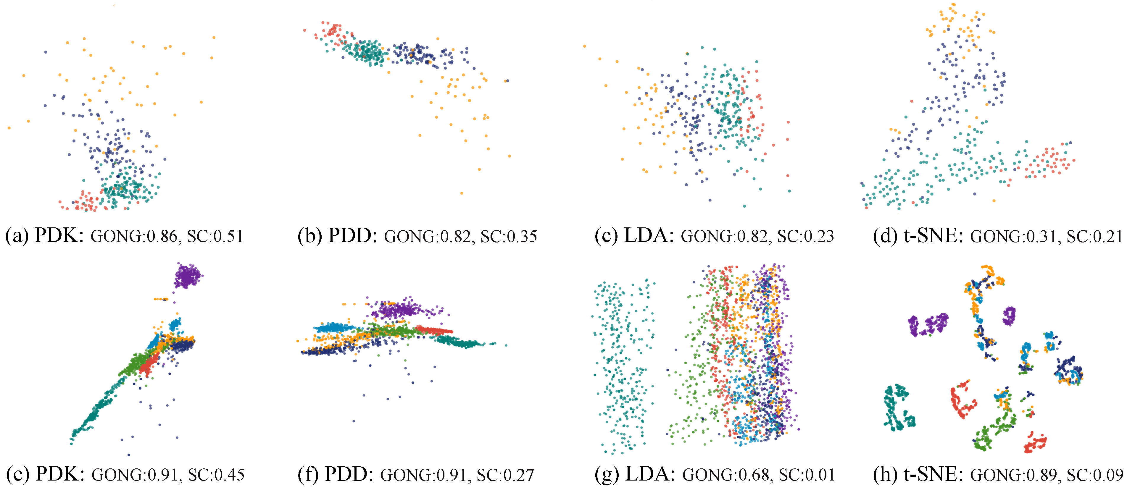 Figure 3: Comparing the class separation quality of PDK, PDD, LDA, and t-SNE (left to right) on FORESTTYPE dataset (top) and STATLOG (bottom) dataset, where the resultant GONG and SC scores for each data are shown next to each subfigure.