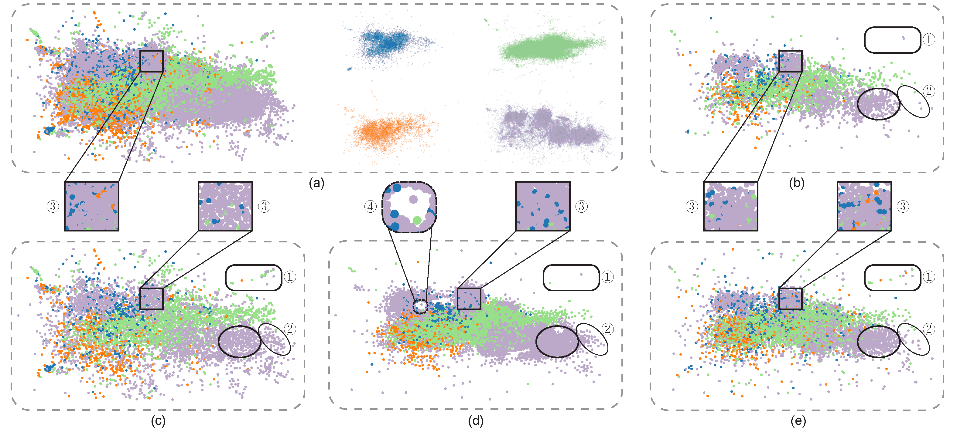 Xin Chen, Tong Ge, Jian Zhang, Baoquan Chen, Chi-Wing Fu, Oliver Deussen, Yunhai WangFigure 1: Different sampling methods for presenting the four-class Person Activity data [8]. (a) The left shows the input scatterplots with 100K points and the right shows the four classes separately, where the patterns of each class are obscured in the main plot, e.g., the three sub-clusters in the purple class, due to overdraw. We re-sample the data into ∼5000 points using (b) random sampling, (c) non-uniform sampling [4], (d) multi-class blue noise sampling [11], and (e) our method. The results show that our method better preserves major outliers (see the rounded boxes labeled with “1”), relative data densities (see the ellipse labeled with “2” to compare (c) with (d)), and the relative class densities (see the orange points shown in the squares labeled with “3” in (a)-(e)), without introducing obvious visual artifacts such as highlighted by the square in (d) labeled with “4”. Points for all results are rendered in random order.