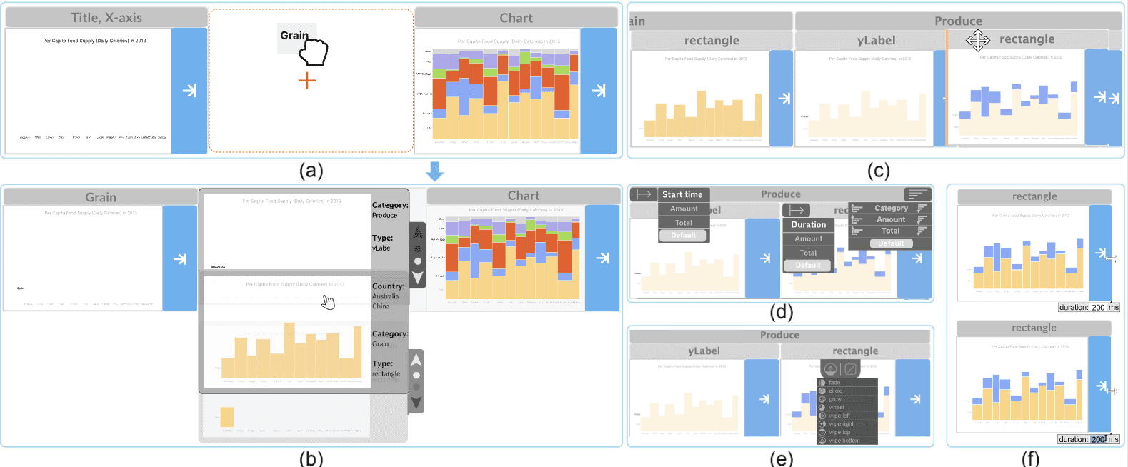 Figure 3: An example procedure of the keyframe and keyframe sequence construction. (a) a tick label is dragged over the dropzone ahead of the keyframe group containing visual marks; (b) after creating a keyframe for the selected label, a list of possible next keyframes is suggested to let the author select to complete the keyframe sequence; (c) dragging one keyframe to make keyframes animate a short time after the previous one started; (d) binding quantitative data attributes to the start time or duration of the keyframes and rearranging the animation order of sibling keyframe groups; (e) selecting effect type for keyframe group; and (f) two ways to update the duration length.
