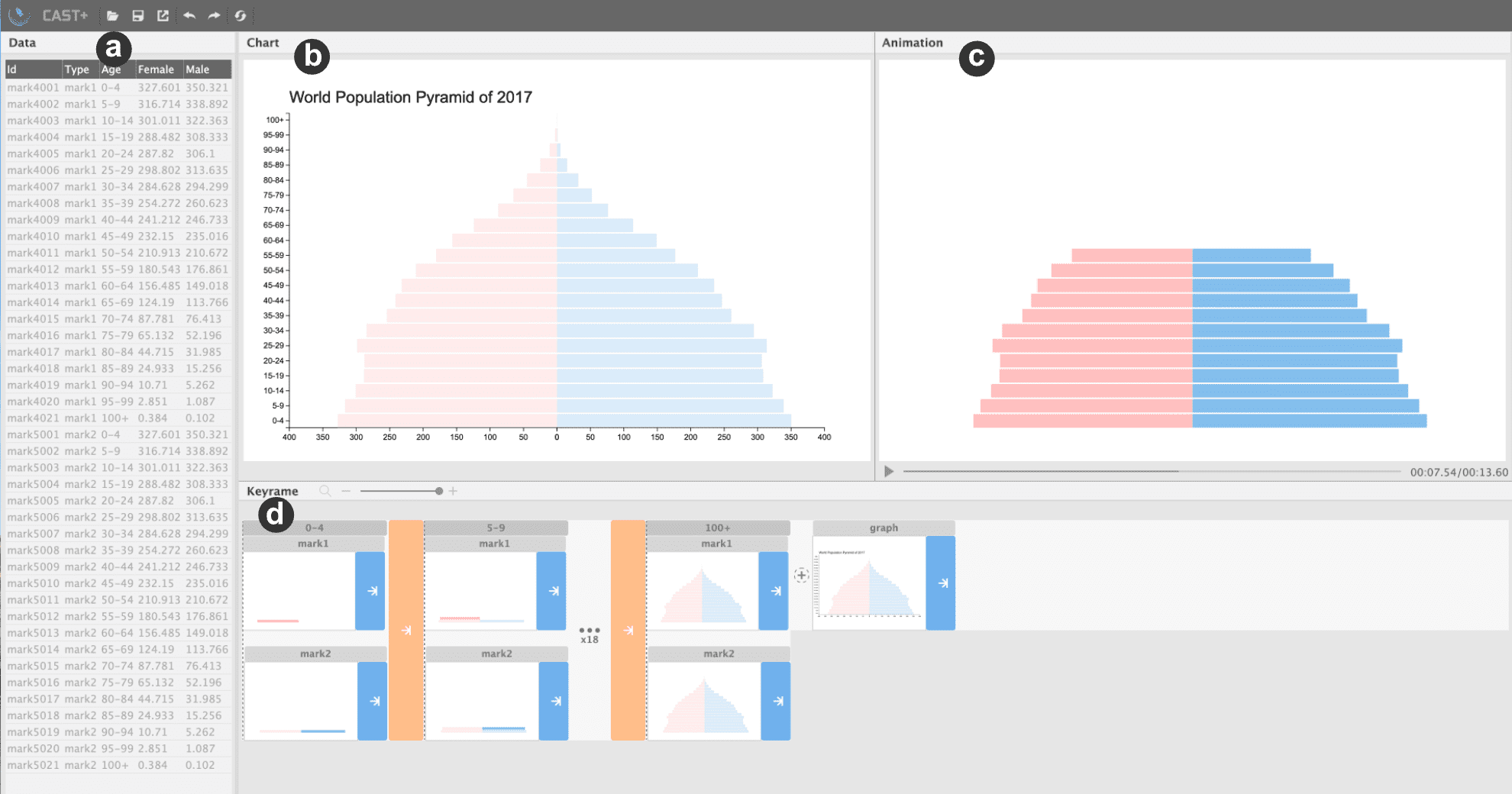 Yuancheng Shen*, Yue Zhao*, Yunhai Wang, Tong Ge, Haoyan Shi, Bongshin LeeFigure 1: CAST+ enables the interactive construction of a variety of data-driven chart animations. Its interface consists of four panels: (a) data panel; (b) chart panel; (c) animation panel; and (d) keyframe panel. In this case, the system is about halfway through the animation of a ‘diverging bar chart,’ showing the distribution of the population by gender in different age groups. Please visit the CAST+ website (https://canisstudio.github.io/CASTPlus) to see the animation.