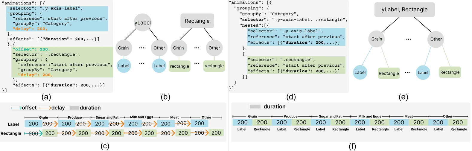 Figure 6: Comparing the Canis specifications for achieving the animation of the Mekko chart in Scenario 2 without (a) and with the nested selection (d). (b,e) the intermediate mark-unit trees generated during the compilation of the given specifications in (a,d); (c) aligning two timelines corresponding to two types of visual marks requires careful specification of duration and delays; whereas the one in (f) is inherently represented as a linear line.