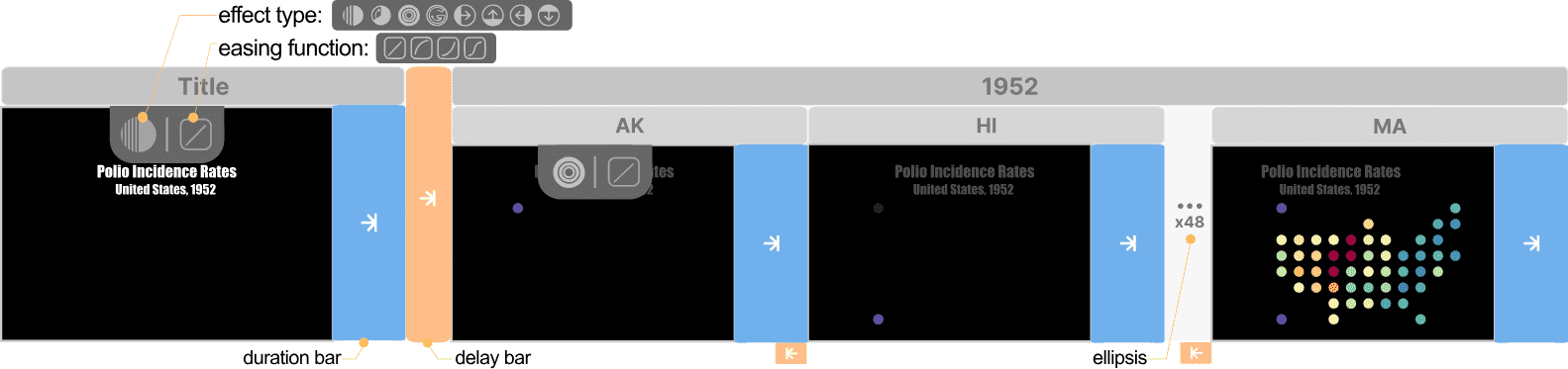 Figure 2: The visual representation of the animation of a map showing the polio incidence rates of the United States in 1952. The title fades in first, then all dots animate according to their rate in an ascending order with the “circle” effect. Such animation is represented by two keyframe groups with other animation properties including timing bars indicating delay, and iconic representation of effect type and easing function (all effect types and easing functions are listed at the top left).