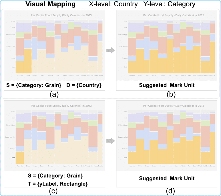 Figure 4: Unlike CAST, CAST+ can suggest additional marks when multiple types of marks are selected by the user. When two rectangles in yellow from different countries are selected (a), all yellow rectangles are highlighted as a suggestion result (b). When a label in the y-axis and its corresponding rectangle of the first country are selected (c), the system suggests all other yellow rectangles (d).
