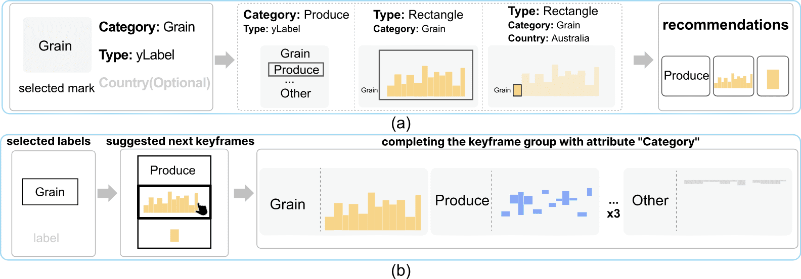 Figure 5: The keyframe sequence auto-completion process with CAST+. (a) computing the suggested next keyframes by analyzing the data attributes associated with the selected label (left), then finding three different keyframes (middle) by changing the value of one attribute or mark type and finally removing the duplicates if there to form the suggested next keyframes (right); (b) constructing the animation sequence by first selecting a label (left), then choosing the keyframe with all yellow bars from a list of suggested next keyframes (middle), and finally the entire keyframe sequence (right) is generated by repeatedly changing the value of the attribute “category.”