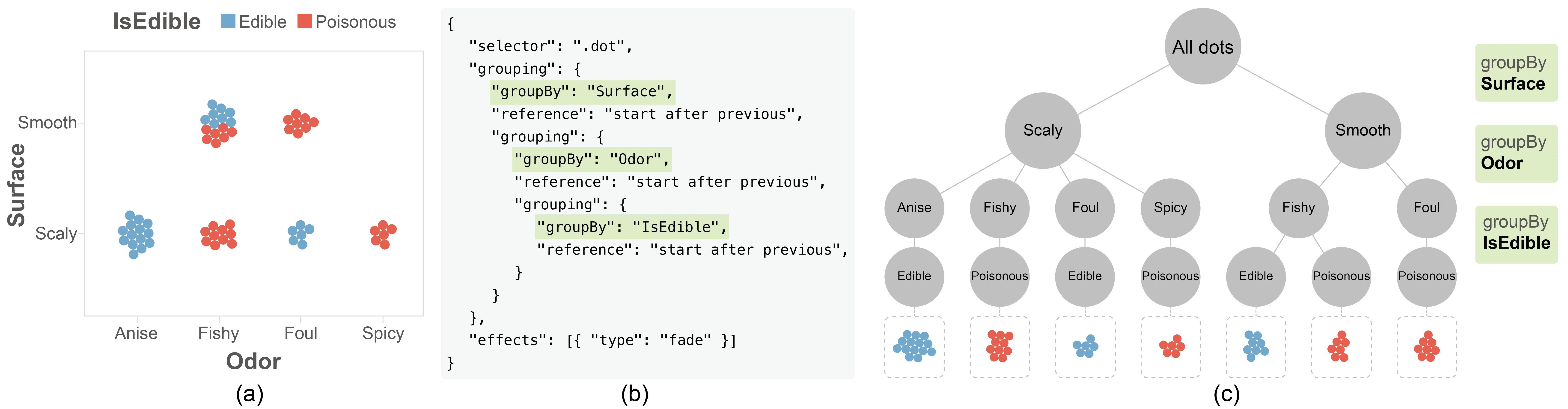 Specification for animating the faceted dot plot with a nested partitioning: (a) input scatterplot encoding three variables (Surface, OdorandIsEdible); (b) Canis specification where three variables used for the nested partitioning are highlighted; and (c) mark unit treefor partitioning the marks into keyframes.