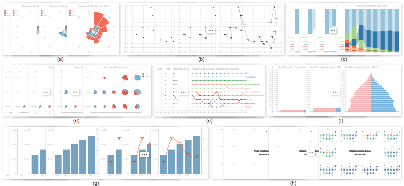 Figure 6: Eight example chart animations demonstrating the expressiveness of CAST. We used the first seven chart animations (a-g) as tasks in our user study in Section~\ref{sec:evaluation}. In addition to these, more examples can be found with the input charts, descriptions, and videos illustrating the creation processes in the website (https://chartanimation.github.io/cast).