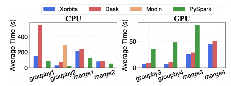 Figure 8: Experiment on two shuffle-intensive DataFrame operators: groupby and merge on CPU(Left) and GPU(Right).