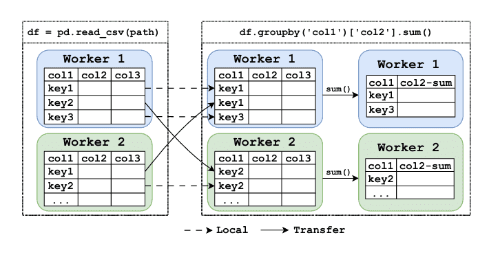 Figure 1: A simple data science pipeline in a distributed environment: loading data followed by a column-wise groupby. Note that this diagram provides a simplifed illustration and does not show the complete MapReduce workflow.