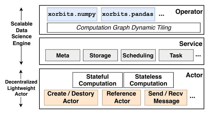 Figure 3: Xorbits system architecture: divided into the decentralized decentralized actor layer and the scalable data science engine layer.