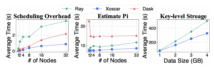 Figure 9: Micro-benchmarks: scheduling aetors (Left), approximating π (Middle), and key-level data storage (Right).