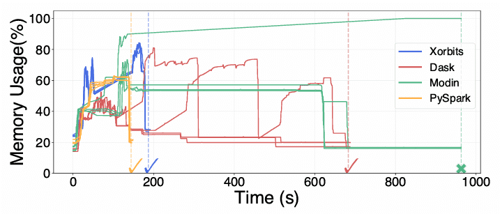 Figure 2: Memory usage during distributed DataFrame groupby on four workers using Xorbits, Dask, PySpark, and Modin on Ray. Each line represents one worker's memory usage over time.