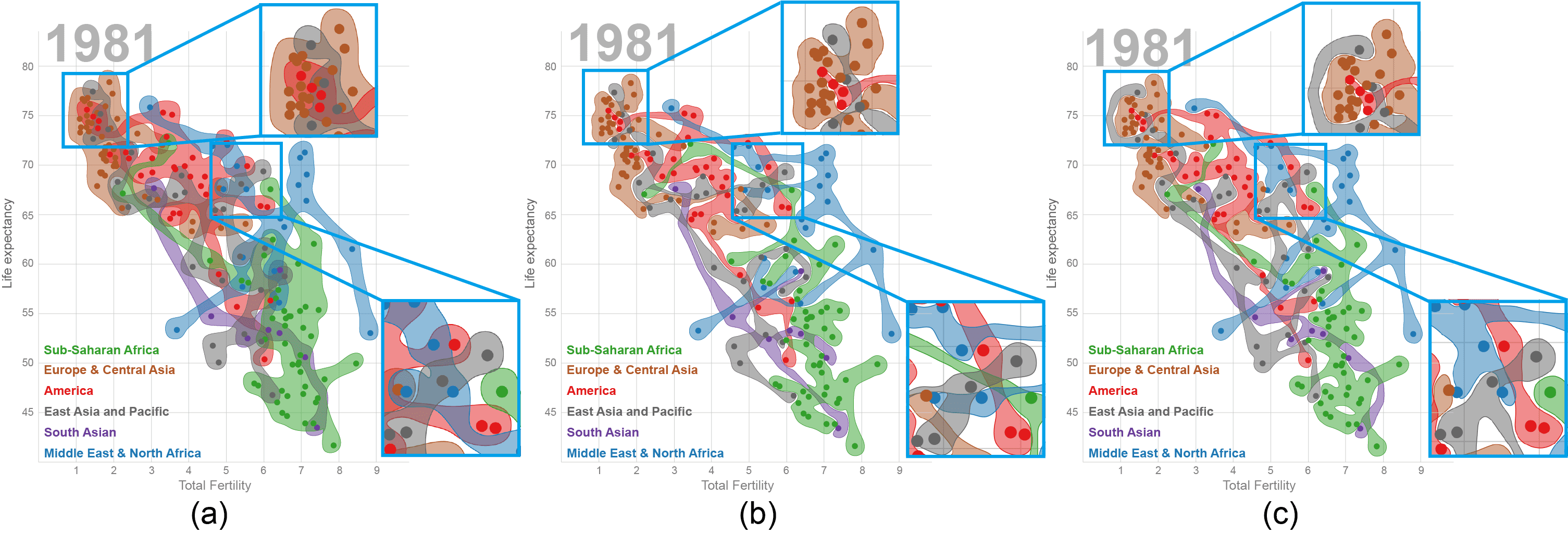 Figure 2: Set visualization of (a) Bubble Sets, (b) F2-Bubbles, and (c) F2-Bubbles after editing 2D scatterplots of life expectancy versus total fertility of countries and regions of the year 1981. Sets are colored based on geographic regions of the world as shown in the legend.