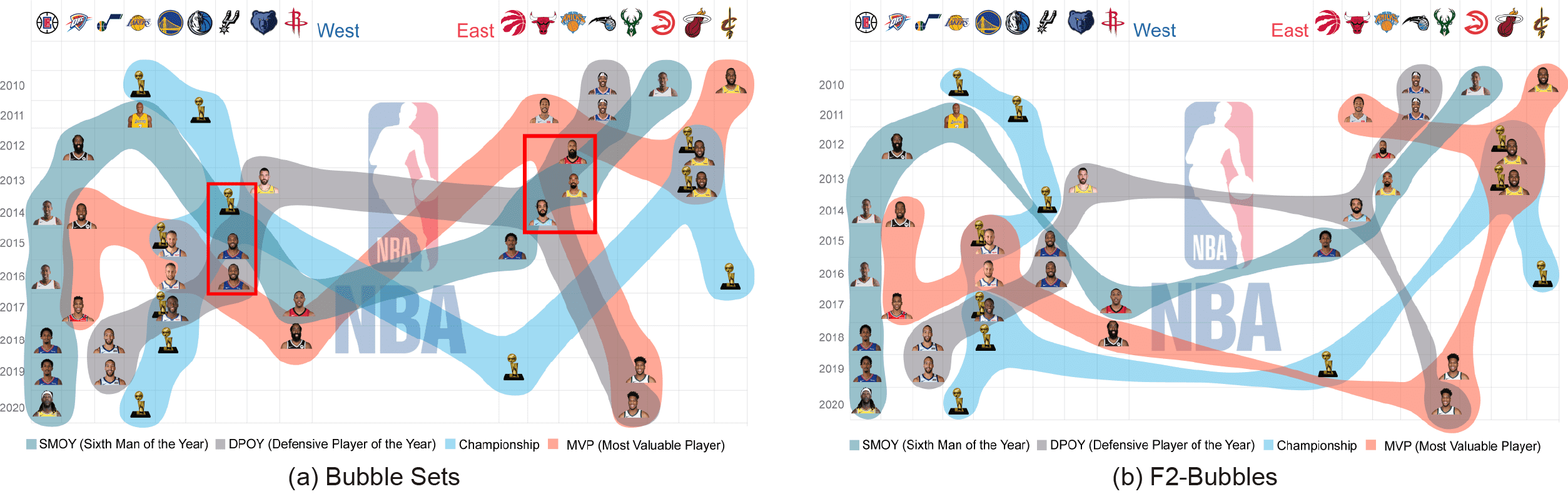 Figure 3: Visualizations of NBA (National Basketball Association) season awards for the years 2010 to 2020 with (a) Bubble Sets, and (b) F2-Bubbles. The horizontal axis of the timeline shows the teams in which the awarded players served, while the vertical axis is the year of the season. Players are indicated by their photos, the winner teams are shown with winner cups. Sets are color-coded by the award type as shown in the legend.