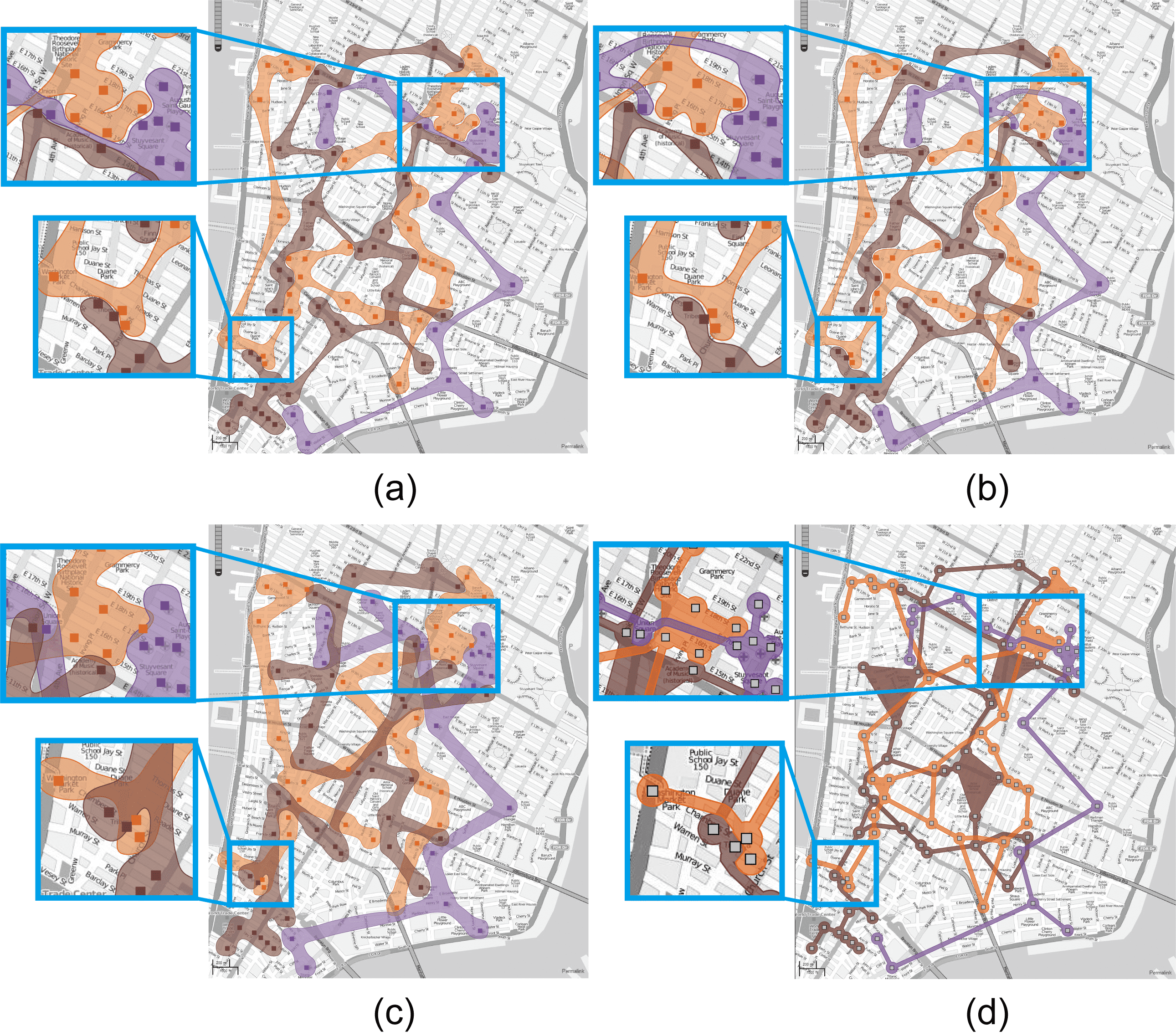 Figure 1: Set visualization of (a) F2-Bubbles right after adaptive construction, (b) after editing, (c) Bubble Sets, and (d) KelpFusion. All sets are visualized over the map of Manhattan (New York). Hotels, subway stations, and clinics are visualized as bubble sets in orange, brown, and purple.