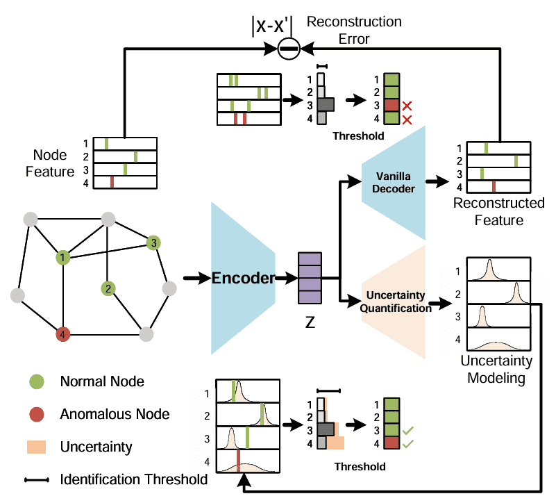 Chunyu Wei*, Wenji Hu*, Xingjia Hao*, Yunhai Wang*, Yueguo Chen, Bing Bai, Fei WangFigure 1: Introducing Uncertainty for anomaly detection.Relying on reconstruction error, nodes 3 and 4 in the graph are misclassified without introducing uncertainty.