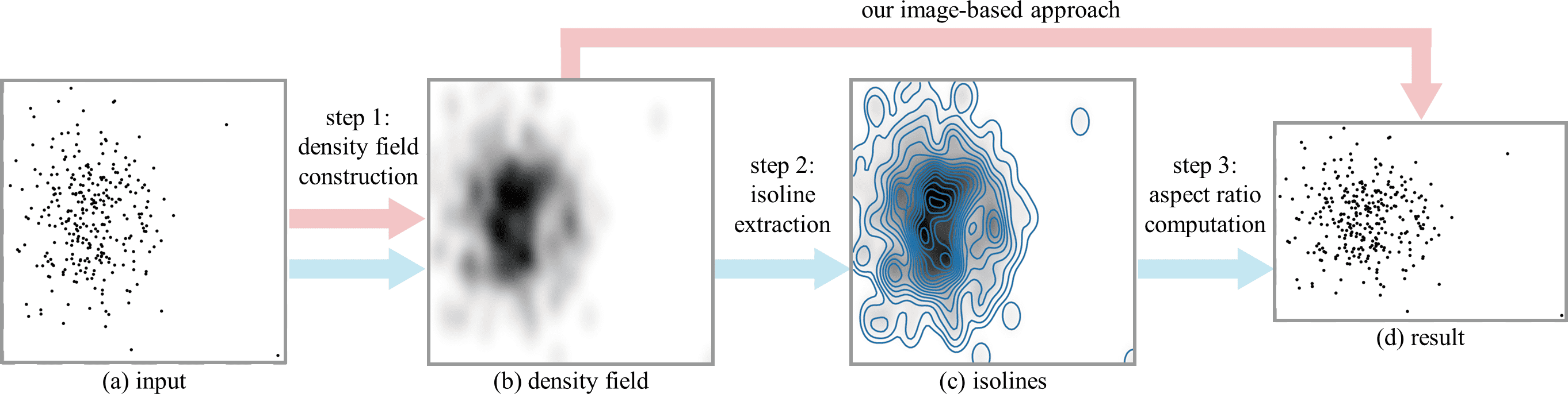Comparative overview of the isoline-based (blue arrows) and our image-based approach (red arrows). Our method bypasses the construction of isolines and directly computes the aspect ratio from the density field. Step 1 is obsolete, if the input data is already given as a density field.