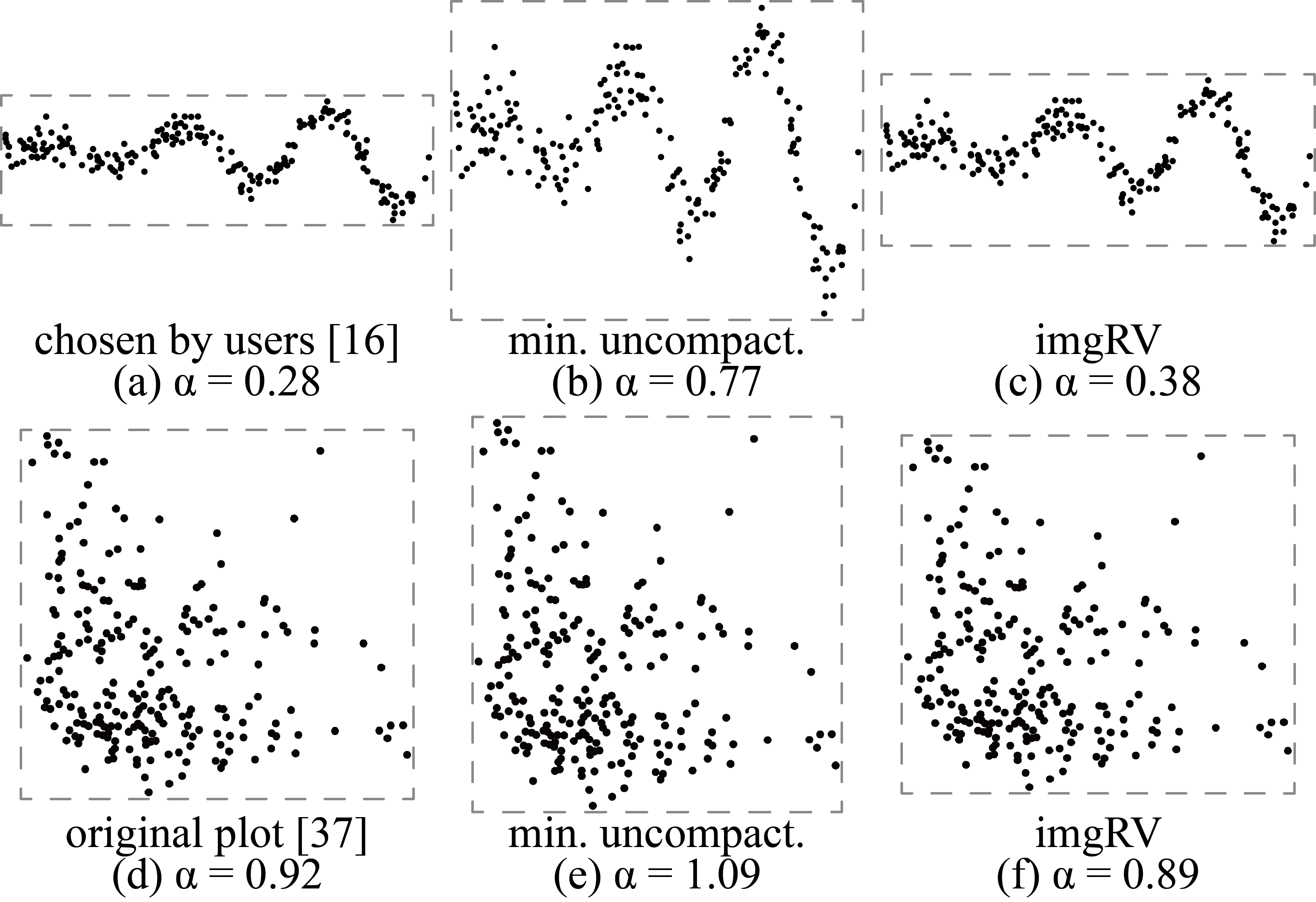Comparing the aspect ratios selected by our method (c, f) and the method of Fink et al. [16] (b, e) to user preferences (a, d): function used in [16] (top) and a data plot extracted from [37] (bottom).