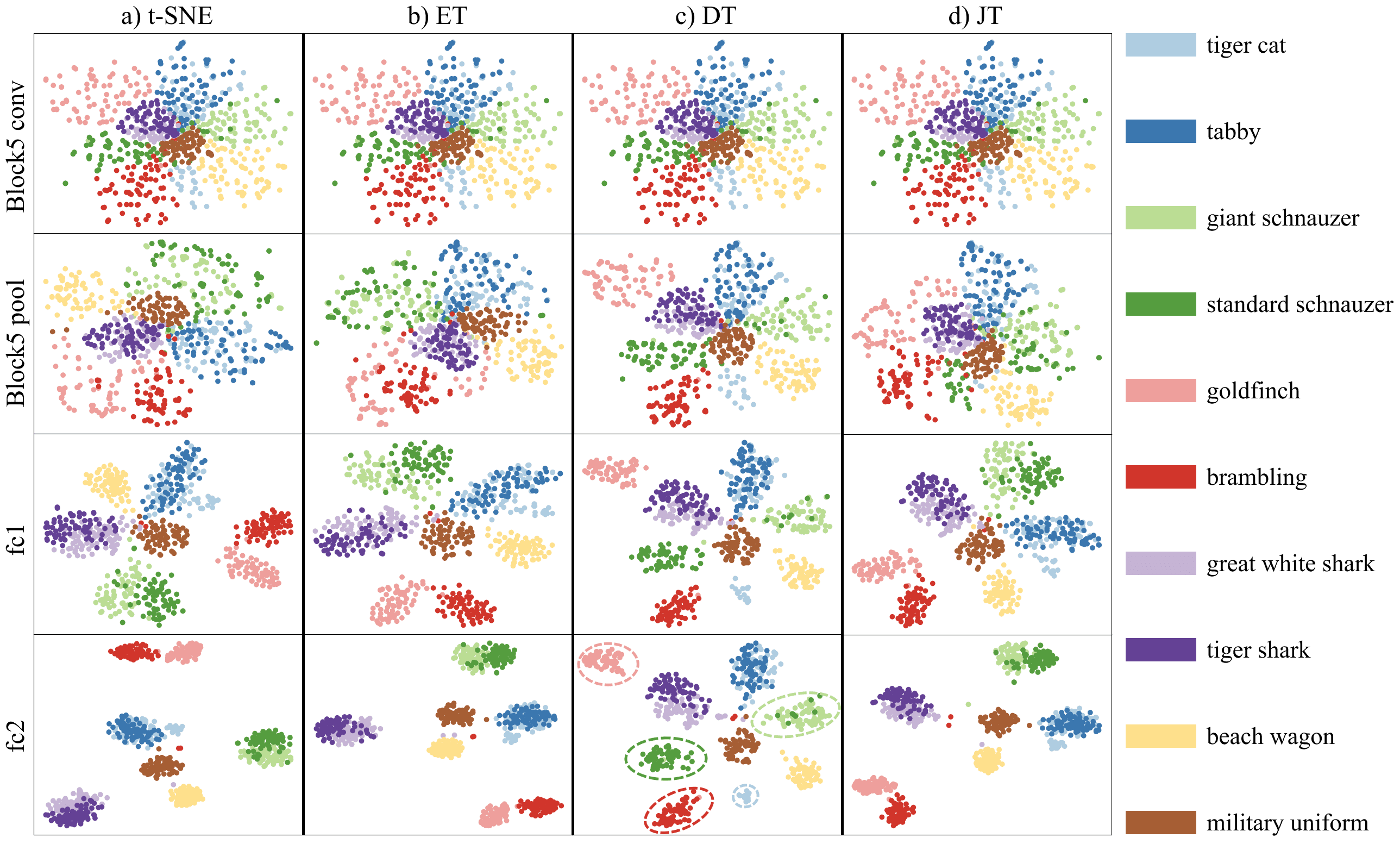 Figure 4: Comparison of the VGG dataset projections of four t-SNE techniques. a) and b) t-SNE and Equal-initialization t-SNE produced faithful but inconsistent projections. See the red and pink clusters moving around the center. c) Dynamic t-SNE produced projections that are too rigid to reflect abrupt changes in topology. For example, the green and light green clusters remain separated at the end, failing to escape from their initial positions. d) Joint t-SNE generated more faithful projections that are robust to such abrupt changes. See the points from a pair of classes (two classes with the same hue) gather as in the t-SNE and Equal-initialization t-SNE projections while providing visual consistency.