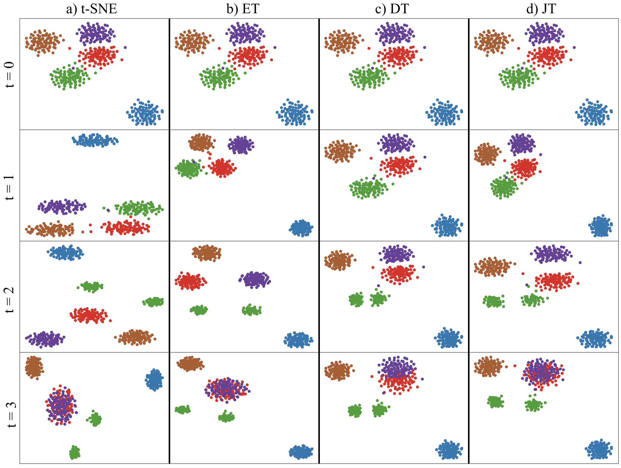 Figure 1: Comparison of the 5-Gaussian dataset projection of four different t-SNE methods. a) t-SNE produced misaligned layouts all across four time frames. b) Equal-initialization t-SNE provides better visual consistency than t-SNE but there are still unnecessary movements of clusters. c) Dynamic t-SNE showed smoothing effect by distorting projections at t = 2 and 3. d) Joint t-SNE generated coherent and reliable projections that reflected the ground-truth transformations of clusters.
