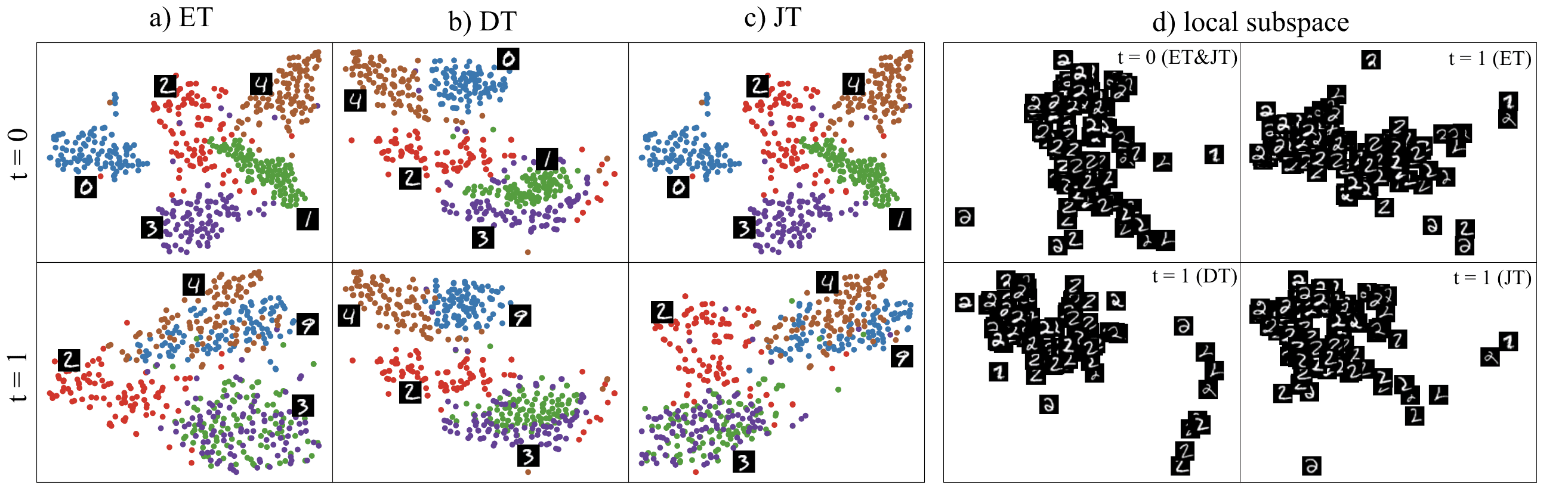 Figure 3: Comparison of the MNIST dataset projection of three t-SNE techniques. Note that since the effect of long-range interference of Dynamic t-SNE was too serious in this case, we did not use its result for t = 0 as the initial projection for other methods as we did in other cases. a) Projecting each frame separately in Equal-initialization t-SNE could faithfully reveal the underlying structure. But when used for comparison tasks, the results can be misleading; for example, people can think that the red cluster for digit 2 changed and the purple cluster of digit 3 moved to the green cluster of digit 1, but the ground truth is the opposite. b) In Dynamic t-SNE, the changes between two frames are subtle even though there were substantial changes. These projections are too consistent, sacrificing fidelity. c) Joint t-SNE successfully detected the changes in topology while preserving the local structure of the red cluster for digit 2 where no change was made. d) Comparison of local subspace shows that Dynamic t-SNE created an artifact of digit 2 on the right side, whereas other methods did not.