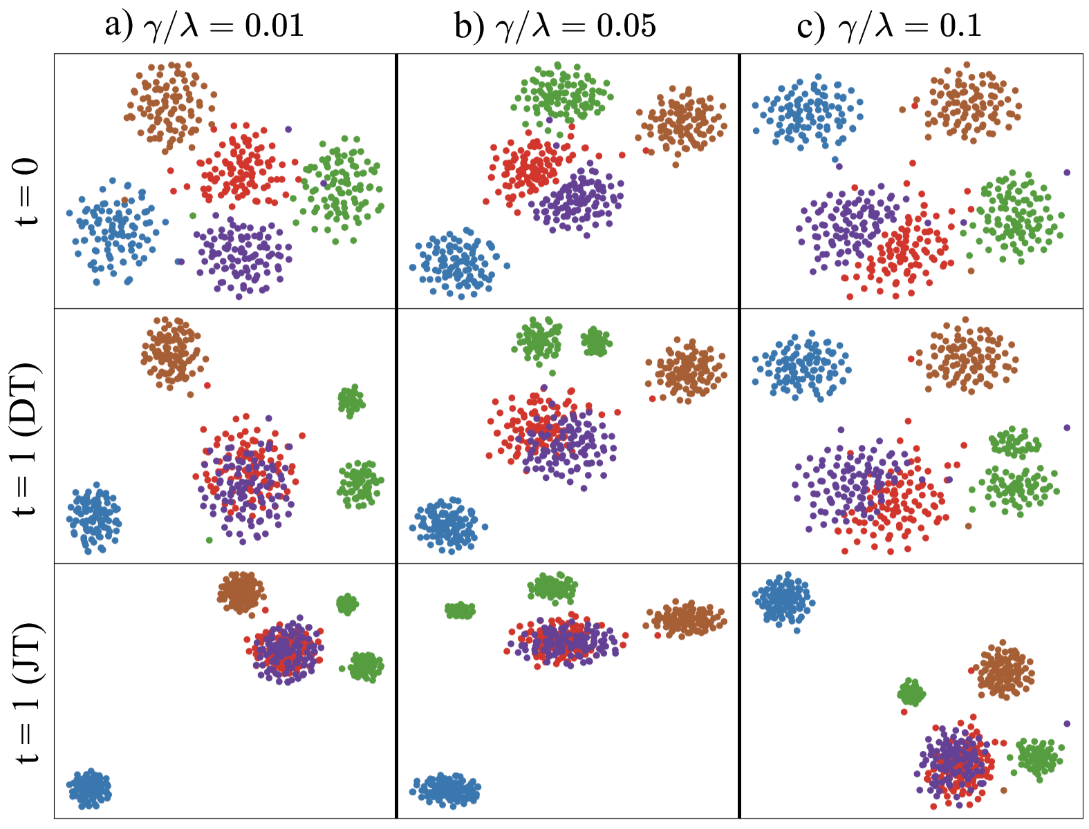 Figure 5: Comparison of the effect of hyperparameters in Dynamic and Joint t-SNE. We used the result from Dynamic t-SNE as the projection of the first time frame for ease of comparison. For Dynamic t-SNE, as λ increases from 0.01 to 0.1, the effect of long-range interference at t = 0 becomes more obvious as the red and purple clusters gets closer, which is a future change. The same is true for smoothing effect at t = 1. Joint t-SNE is robust to the change of γ; see the red and purple clusters fully overlap regardless of γ.