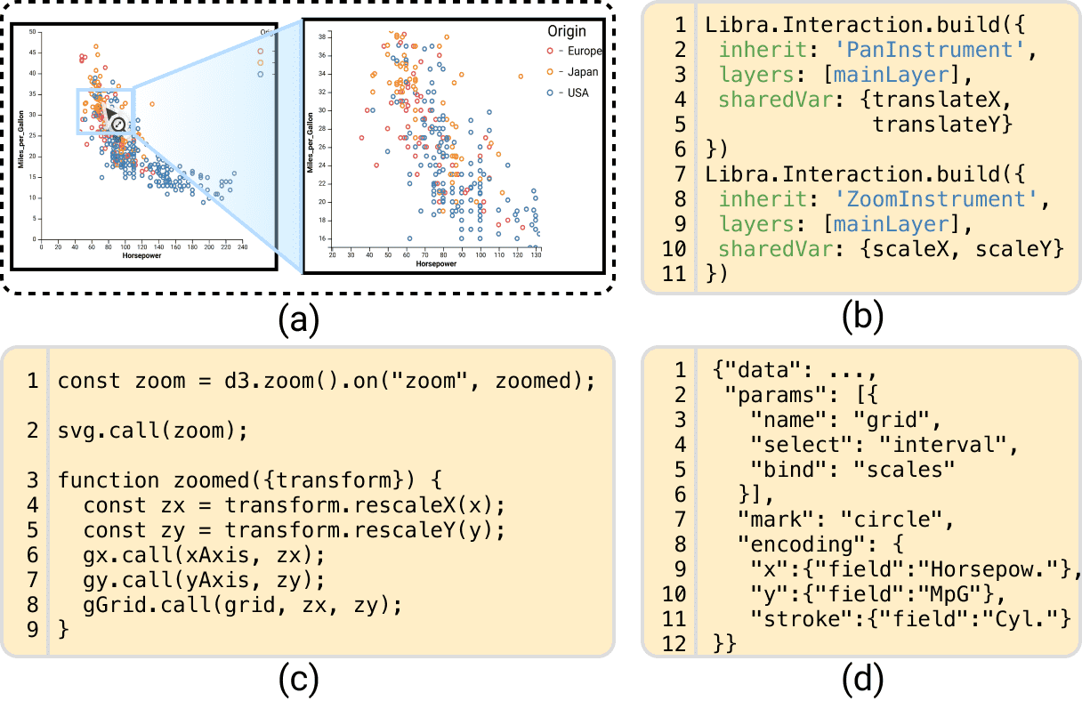 Figure 6: Comparing the implementations of Libra.js, D3 and Vega-Lite for the panning & zooming. (a) The snapshots for zooming a scatterplot. (b) The Libra.js specification consists of the separated pan and zoom instruments, and (c,d) the D3 implementation and Vega-Lite specifications coupling pan and zoom operations.