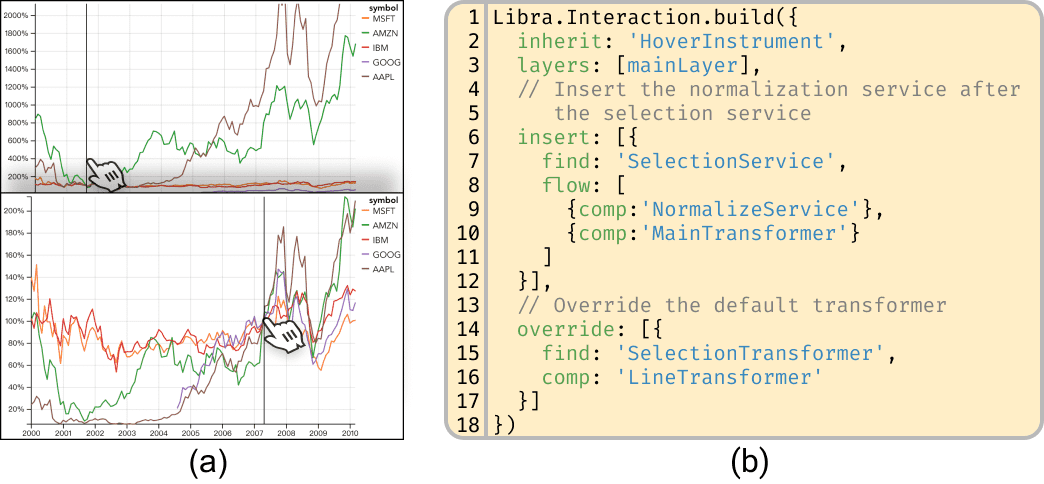 Figure 7: Example of composing instruments for implementing (a) the index chart and (b) corresponding code snippets for composing these new instruments with Libra.js.