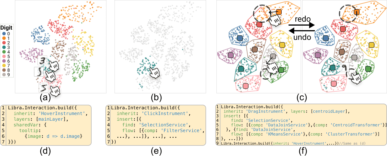 Yue Zhao, Yunhai Wang, Xu Luo, Yanyan Wang, Jean-Daniel FeketeFigure 1: Libra facilitates efficient interaction modeling by enabling the reuse, extension, and combination of built-in interactions. Its prototype, Libra.js, supports seamless exploration of the t-SNE projection of the MNIST dataset with various interactions: (a) hovering a point to show the corresponding image, (b) clicking a data point to highlight the whole class, and (c) dragging cluster centroids to interactively refine k-means clustering while seamlessly integrating with point hovering from (a). (d,e,f) The corresponding Libra.js code snippets for the interactions in (a,b,c), respectively.