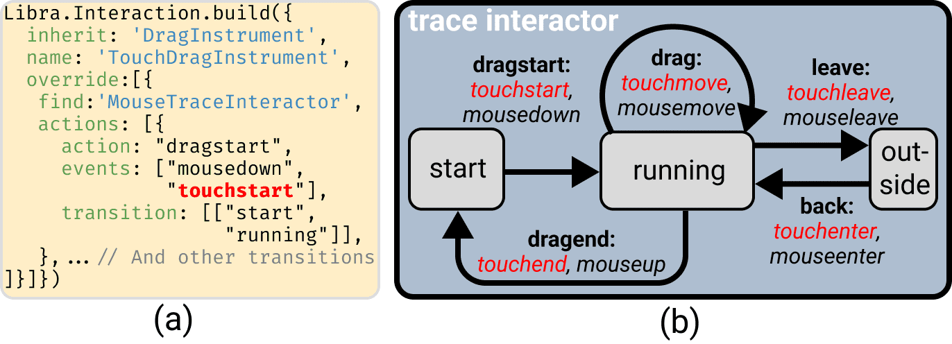 Figure 4: Extending the trace interactor used by the drag instrument in Figure 1c to support touch operations. (a) The Libra.js specification that adds the touch operations to the interactor; (b) a state machine with the transition between states triggered by different low-level events.