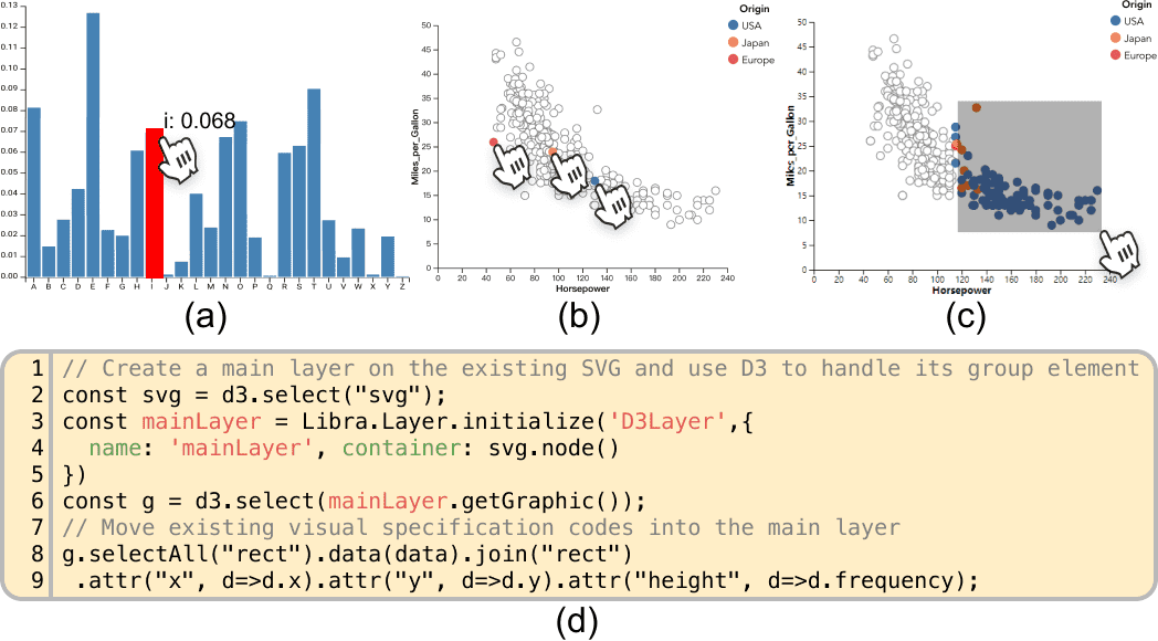 Figure 5: Examples of reusing built-in instruments: (a) hovering, (b) multiple clicking, and (c) brushing; and (d) a code snippet for gluing existing visualizations with Libra.js’s instrument.