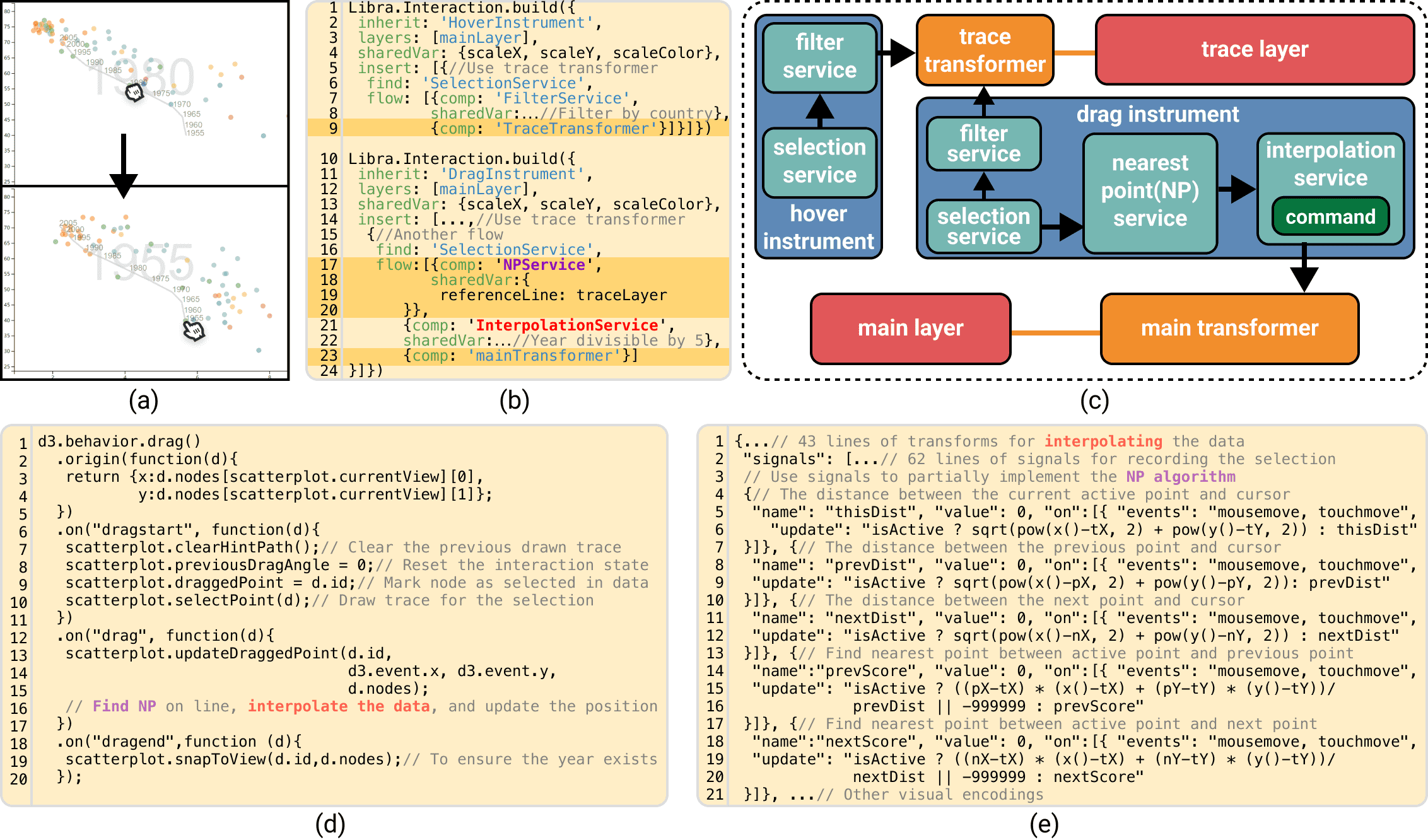 Figure 8: Implementing the DimpVis interaction technique. (a) Two snapshots of this interaction; (b) Libra specification (custom components in orange); and (c) communication between all components, where the orange ones are defined by ID. (d) D3 code requiring ID to provide callback functions for all three events. (e) Vega specification for finding the point nearest to the point dragged on the time trajectory