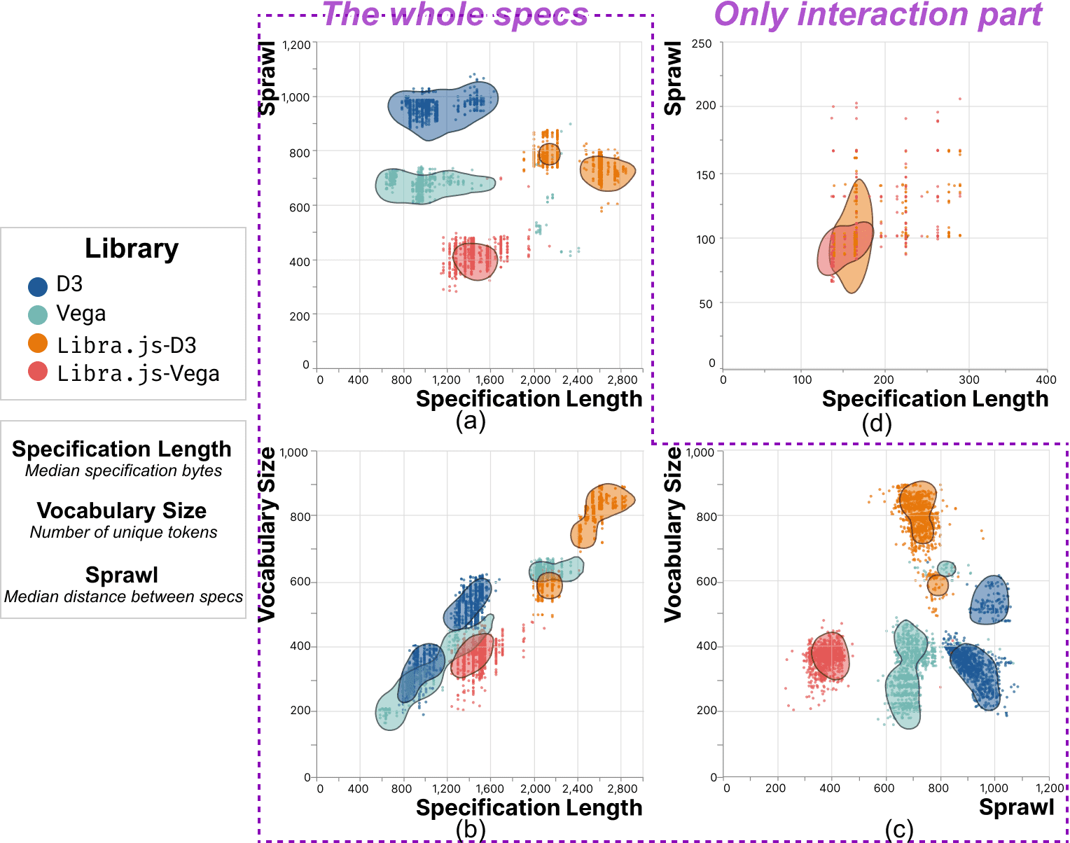 Figure 9: We run 1k bootstrapped variations for each metric based on our gallery, with (a-c) and without the static visualization code (d), and show the results via a scatter plot with a Kernel Density Estimation (KDE) of each pair of metrics: specification length, vocabulary size, and sprawl. Each scatter represents the median value of one variation, while the shaded regions represent the areas containing 75% of the probability mass of each library’s KDE distribution.