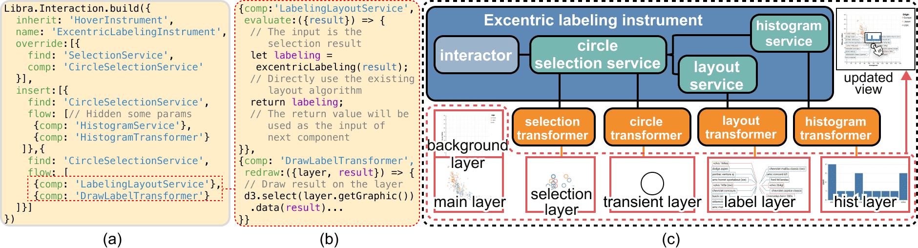 Figure 3: Illustrating the design of a new instrument with Libra.js. (a) The specifications for creating an excentric labeling instrument; (b) the specifications for creating a new layout service and the corresponding transformer; (c) (top left) The components used for composing an excentric labeling instrument to support this interaction for scatterplots; (bottom left) the main layer and the other three layers generated by interactions; and (right) the final result.