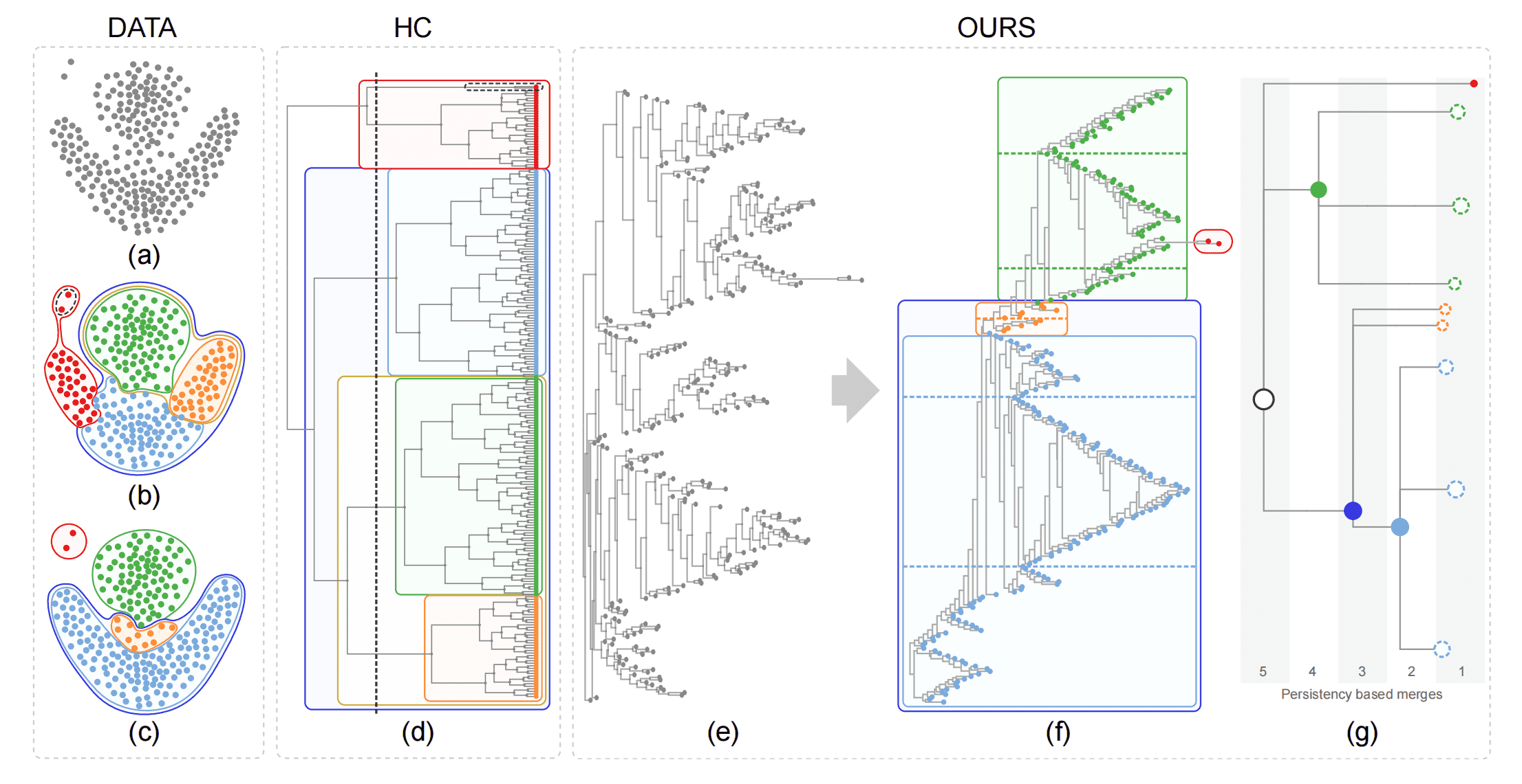 Figure 1: A given dataset (a) is better clustered by our optimally ordered orthogonal neighbor joining tree (O3NJTree) (f) than by a dendrogram (d) produced by the hierarchical clustering (HC) method with complete linkage. Subfigure (b) shows the nested five clusters generated by cutting the dendrogram with a minimum similarity bar; (c) shows four clusters automatically extracted with our method; (e) displays the NJ tree with random leaf order while (f) shows the same tree with optimal leaf order (left) and resulting cluster tree (right) as described in the paper.