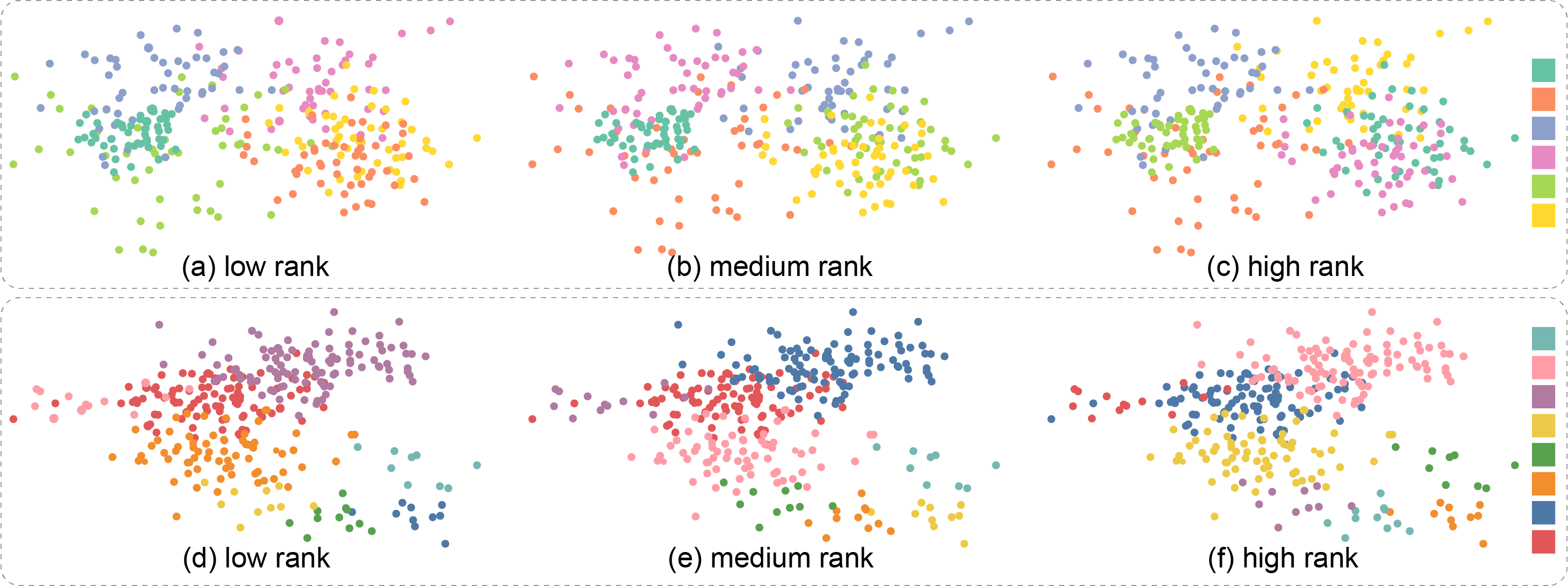 Yunhai Wang, Xin Chen, Tong Ge, Chen Bao, Michael Sedlmair, Chi-Wing Fu, Oliver Deussen, Baoquan ChenFigure 1:The color assignment has a strong influence on the visual separability of class structures shown in multiclass scatterplots. Here we show synthetically labeled six-class (top row) and eight-class (bottom row) datasets, and color palettes from ColorBrewer (a,b,c) and Tableau (d,e,f). Scatterplots are displayed from left to right using color assignments produced by our method with the lowest (i.e., poor) scores ranked by our separation measure (a,d) towards the one with the highest (i.e., best) scores (c,f).
