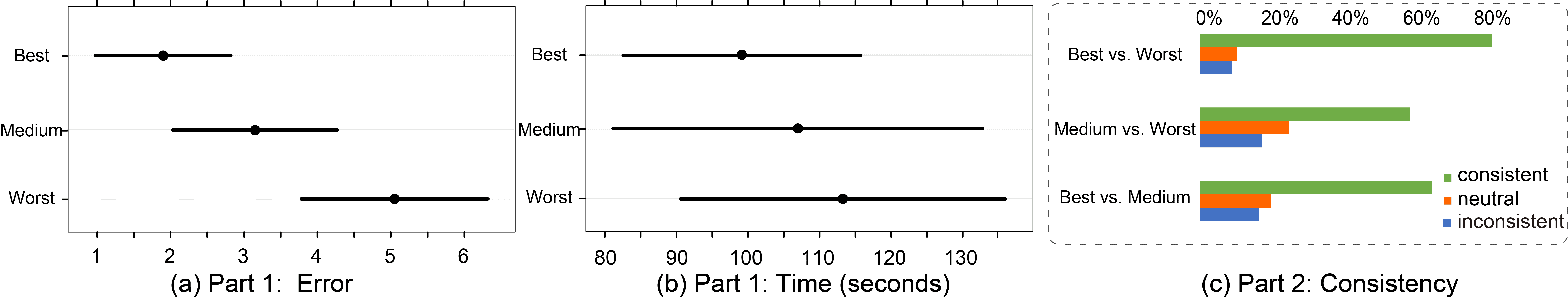 Figure 4: Results of the lab studies. For part 1, we show mean values and deviation as 95% CIs of (a) user error, (b) time (lower values are better). For part 2, we display the consistency between peoples choice and the rating of our method (c). If the user chose the better scatterplot of a pair, the choice was marked with onsistent, otherwise inconsistent. If they choose No preference, the result was neutral.