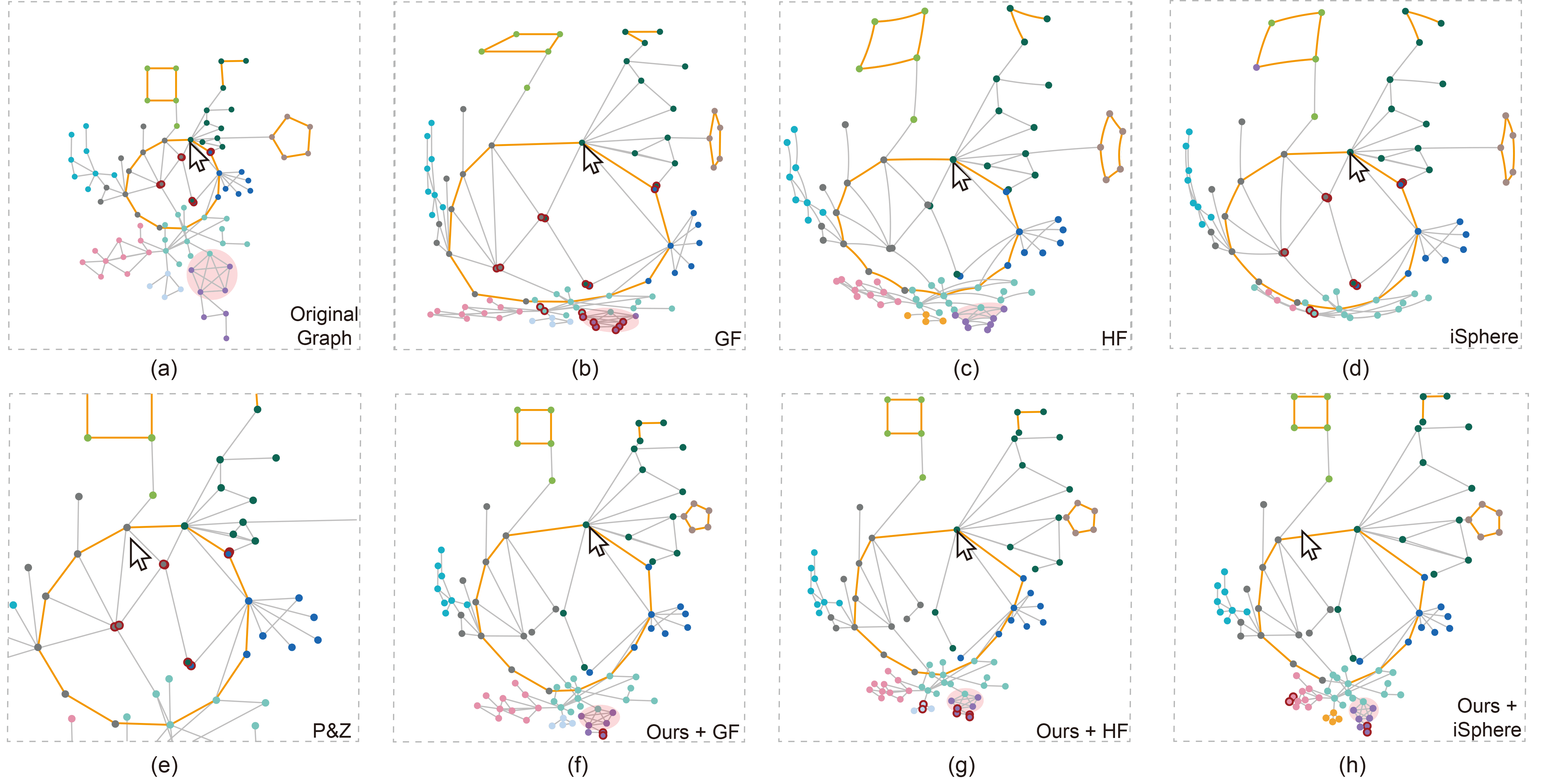 Figure 8: Visual comparison of various fisheye methods: (a) the original graph; (b) graphical fisheye (GF); (c) hyperbolic fisheye (HF); (d) iSphere; (e) linear magnification; (f) our method with graphical fisheye; (g) our method with hyperbolic fisheye; and (h) our method with iSphere.