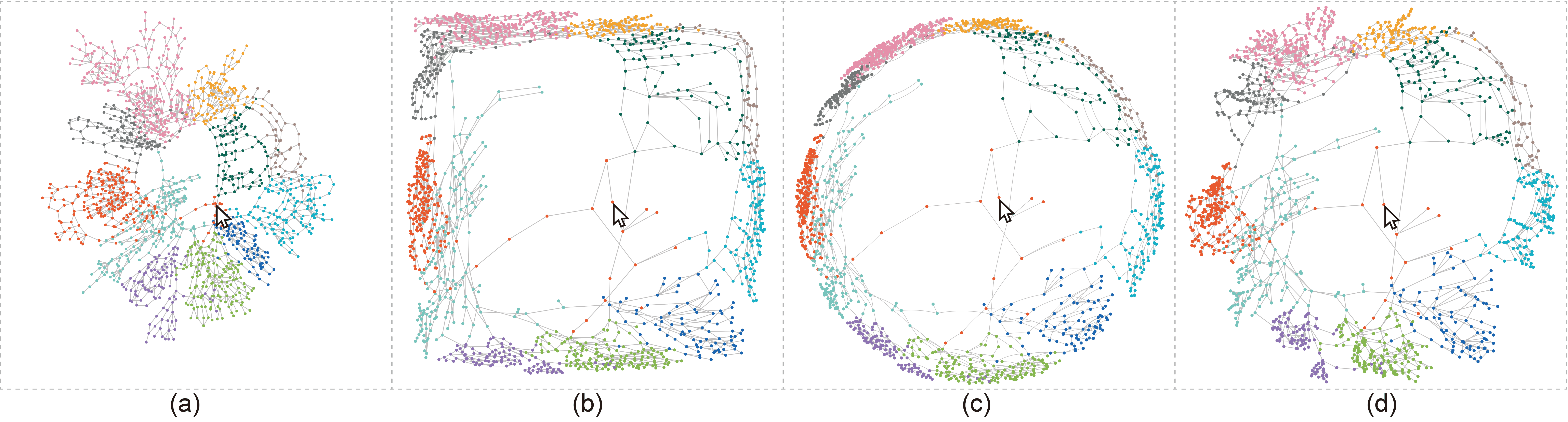 Yunhai Wang, Yanyan Wang, Haifeng Zhang, Yinqi Sun, Chi-Wing Fu, Michael Sedlmair, Oliver Deussen, Baoquan ChenFigure 1: Magnifying a node-link diagram (a) with 11 clusters around a user-specified location (indicated by the cursor) using different fisheye lenses: (b) graphical fisheye; (c) hyperbolic fisheye; and (d) our structure-aware fisheye, which aims to maintain the shapes of almost all clusters and to minimize their distortions, such as in (b,c).